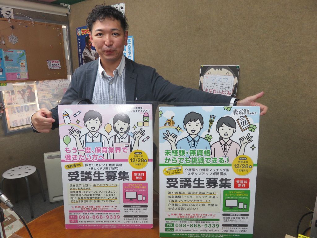 12/20ゲスト:学校法人大庭学園『保育・介護職受講生募集』 法人事務局 総務部 法人総合企画課 推進 大城貴博さん♪ 募集締切は、令和4年12月28日㈬15時まで!! 詳しくは、098-868-9339(担当:中村) 受講生募集_保育 受講生募集_介護 ※この記事は下記の番組より投稿しております。月~金 14:00~14:50にこにこ情報BOX「にこにこ情報BOX」は毎回懐かしい音楽と素敵なゲストをお招きしてお届けする番組です。どうぞにこにこスマイル(^・^)でお付き合い下さい。 月~金14:00~14:50放送。80.6MHzにあわせて下さいね!担当パーソ […]