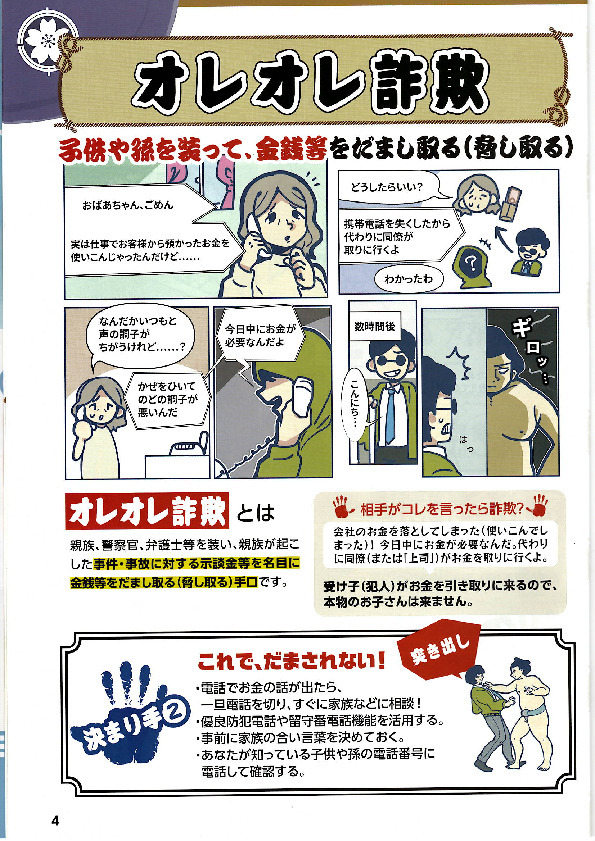 オレオレ詐欺 ー子供や孫を装って、金銭等をだまし取る(脅し取る)ー オレオレ詐欺とは親族、警察官、弁護士等を装い、親族が起こした事件・事故に対する示談金等を名目に金銭等をだまし取る(脅し取る)手口です。 特殊詐欺犯罪被害防止 決まり手10 「オレオレ詐欺」 -公益財団法人 全国防犯協会連合会-