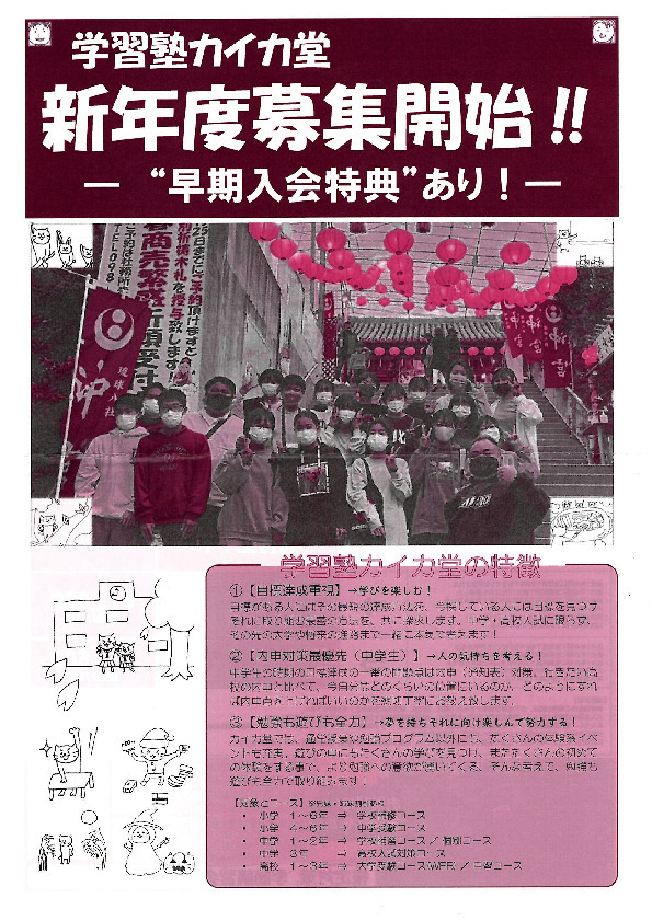 学習塾カイカ堂 新年度募集開始!! 楽しい学びで君もハナサク(*´▽`*) お問い合わせ 田原校:098-996-4815 宇栄原校:098-851-3754 学習塾カイカ堂 新年度募集開始_表 学習塾カイカ堂 新年度募集開始_裏 カイカ堂の伊計公人先生がパーソナリティを務める番組 「伊計先生の夢ラジオ」は、毎月第4月曜日午後9時放送♪
