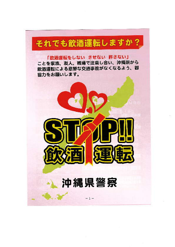STOP飲酒運転「それでも飲酒運転しますか?」 沖縄県警察のパンフレットです。 STOP飲酒運転_それでも飲酒運転しますか_1 飲酒運転の罰則 STOP飲酒運転_それでも飲酒運転しますか_2 アルコールの知識 STOP飲酒運転_それでも飲酒運転しますか_3 飲酒運転が及ぼす代償 STOP飲酒運転_それでも飲酒運転しますか_4