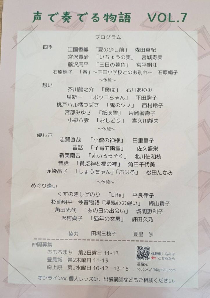 癒やしのひと時をもたらしてくれる久乃さん主宰する“朗読Roomれでぃえんと”の生徒さん達による朗読会「声で奏でる物語VOL.7」のお知らせです^^
