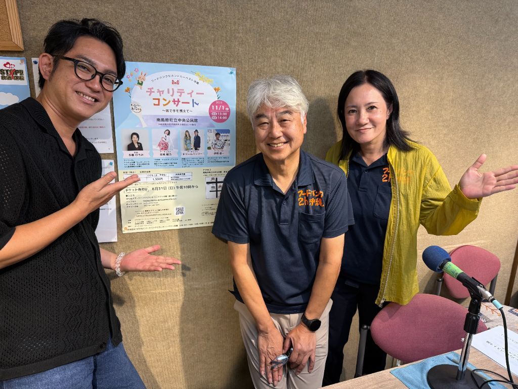 向かって左から伊禮俊一さん(三線を弾くシンガーソングライター)、NPO法人フードバンクセカンドハーベスト沖縄の西川徹さん(理事)、奥平智子さん(代表理事)です。