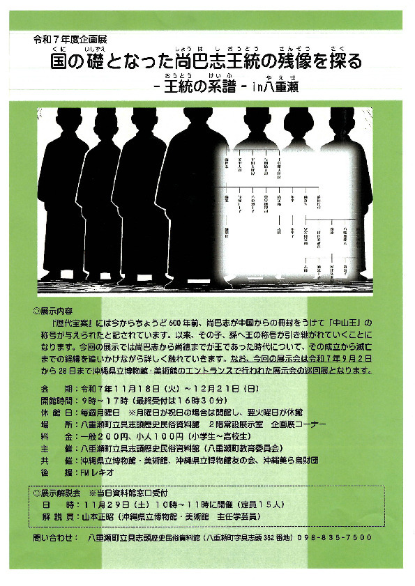 令和7年度企画展‐王統の系譜-in八重瀬 尚巴志王統の残像を探る及びフィールドツアー おきみゅーの山本さんです。 尚巴志に興味がある方は是非八重瀬町立具志頭歴史民俗資料館にお出かけ下さい。 会期:令和7年11月18日(火)~12月21日(日) 開館時間:9時~17時(最終受付は16時30分) ※この記事は下記の番組より投稿しております。月~金 14:00~14:50にこにこ情報BOX「にこにこ情報BOX」は毎回懐かしい音楽と素敵なゲストをお招きしてお届けする番組です。どうぞにこにこスマイル(^・^)でお付き合い下さい。 月~金14:00~14:50放送。80.6MHzにあわせて下さいね!担当パーソ […]
