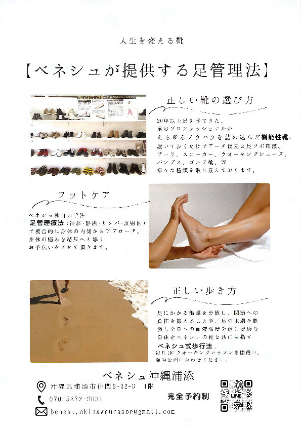 ベネシュ沖縄浦添は、機能性の靴の取り扱いと正しい歩き方の伝授、足マッサージを行うサロンです!(足管理療法のご提供)