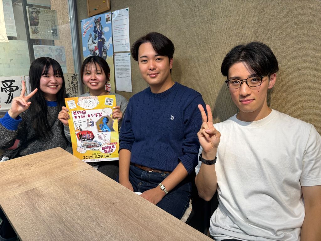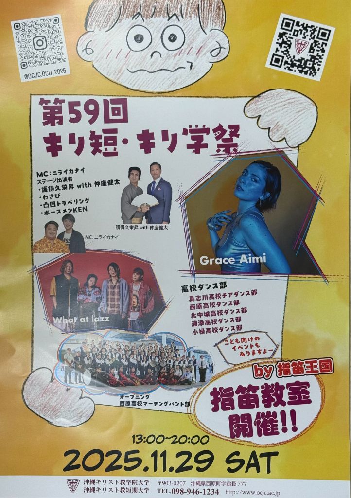 11/26ゲスト:「第59回 キリ短・キリ学際」開催のお知らせ♪ 沖縄キリスト教学院大学の学際実行委員の皆さん 左から)島袋美月さん、前濱真央さん、伊波雄吏さん、瓦葺雄大さん ※この記事は下記の番組より投稿しております。月~金 14:00~14:50にこにこ情報BOX「にこにこ情報BOX」は毎回懐かしい音楽と素敵なゲストをお招きしてお届けする番組です。どうぞにこにこスマイル(^・^)でお付き合い下さい。 月~金14:00~14:50放送。80.6MHzにあわせて下さいね!担当パーソ […]