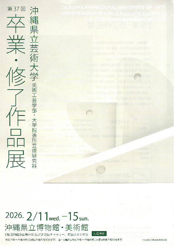 沖縄県立芸術大学の卒業・修了作品展が2026・2/11(水)~2/15(日)まで沖縄県立博物館・美術館で行われます。是非足を運んで若き芸術家の作品を鑑賞してください。