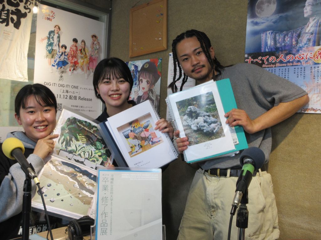 向かって左から工芸専攻の織分野の福田さん、染分野の國吉さん、陶芸分野の辺士名さんです。